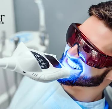 تبييض الأسنان بالليزر هو إجراء تجميلي غير جراحي يتم داخل العيادة، ويعتمد على استخدام مادة تبييض طبية عالية التركيز يتم تنشيطها بواسطة ضوء خاص، مما يسمح باختراق التصبغات العميقة دون الإضرار ببنية السن.